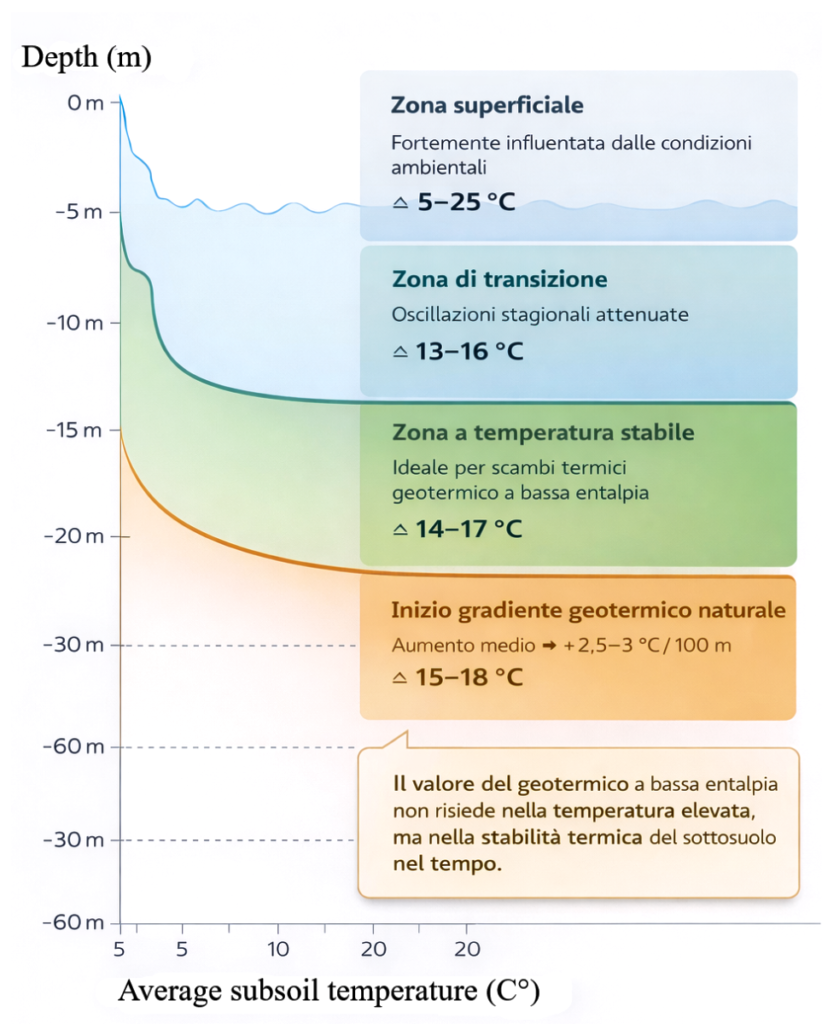 The study of thermal exchange with the subsoil represents one of the central aspects of Silver Innovation Lab’s approach to low-enthalpy geothermal energy. At depths approximately between 15 and 30 meters, ground temperature tends to remain nearly constant throughout the year, with average values in the range of 14–17 °C, being only marginally influenced by seasonal variations and surface climatic conditions. This thermal stability makes the subsoil a resource particularly suitable for the exploration of passive heat exchange systems, in which the objective is not the extraction of high-temperature energy, but rather the efficient management of thermal flows through limited and time-stable temperature differences.