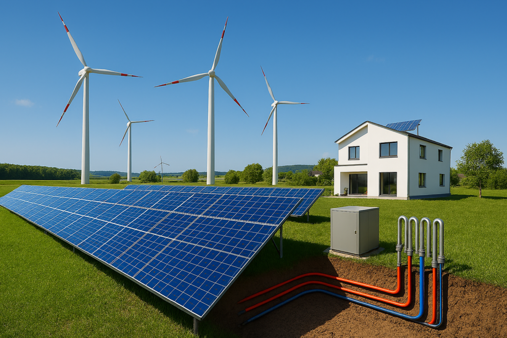 In this architecture, the subsoil provides a stable thermal source, the heat pump acts as the primary generator, and the electrical energy required for its operation can be partially supplied by photovoltaic production.