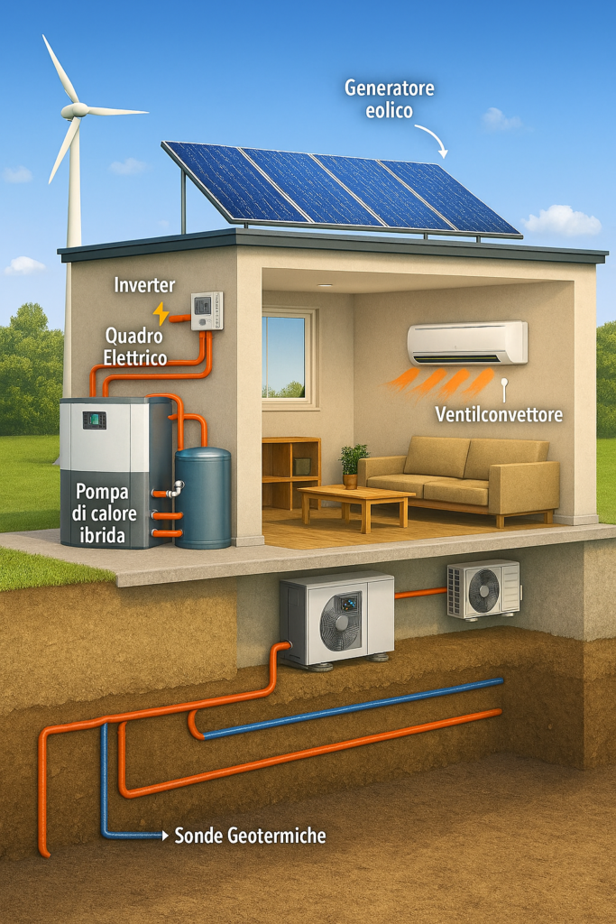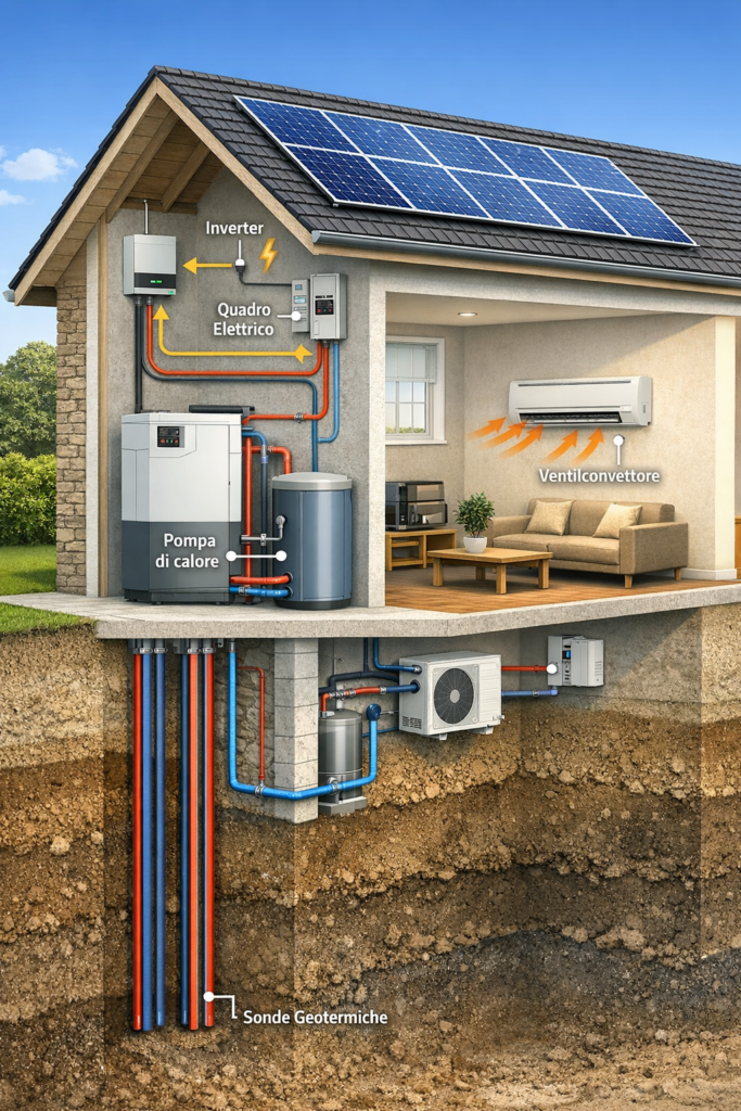 Una delle configurazioni più flessibili e tecnicamente coerenti per l’impiego dell’energia geotermica a bassa entalpia in ambito residenziale è rappresentata dall’integrazione di sonde geotermiche o collettori di scambio, pompa di calore, impianto fotovoltaico e sistemi di distribuzione a ventilconvettori, in assenza di riscaldamento a pavimento.